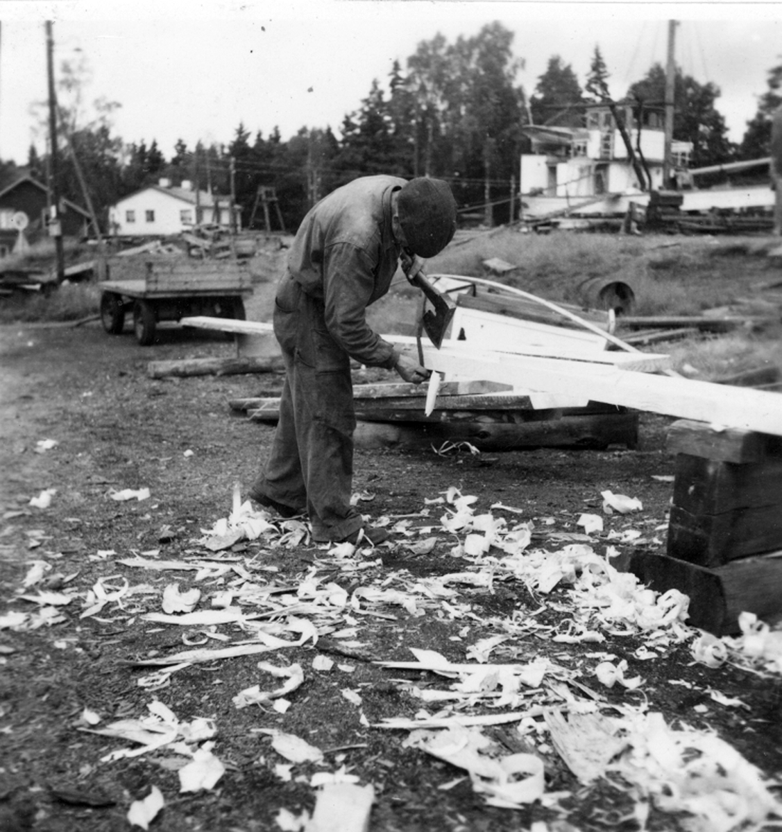 Skevningen av fogkanten på en bordplanka märkes ut och hugges till, aug 1954.