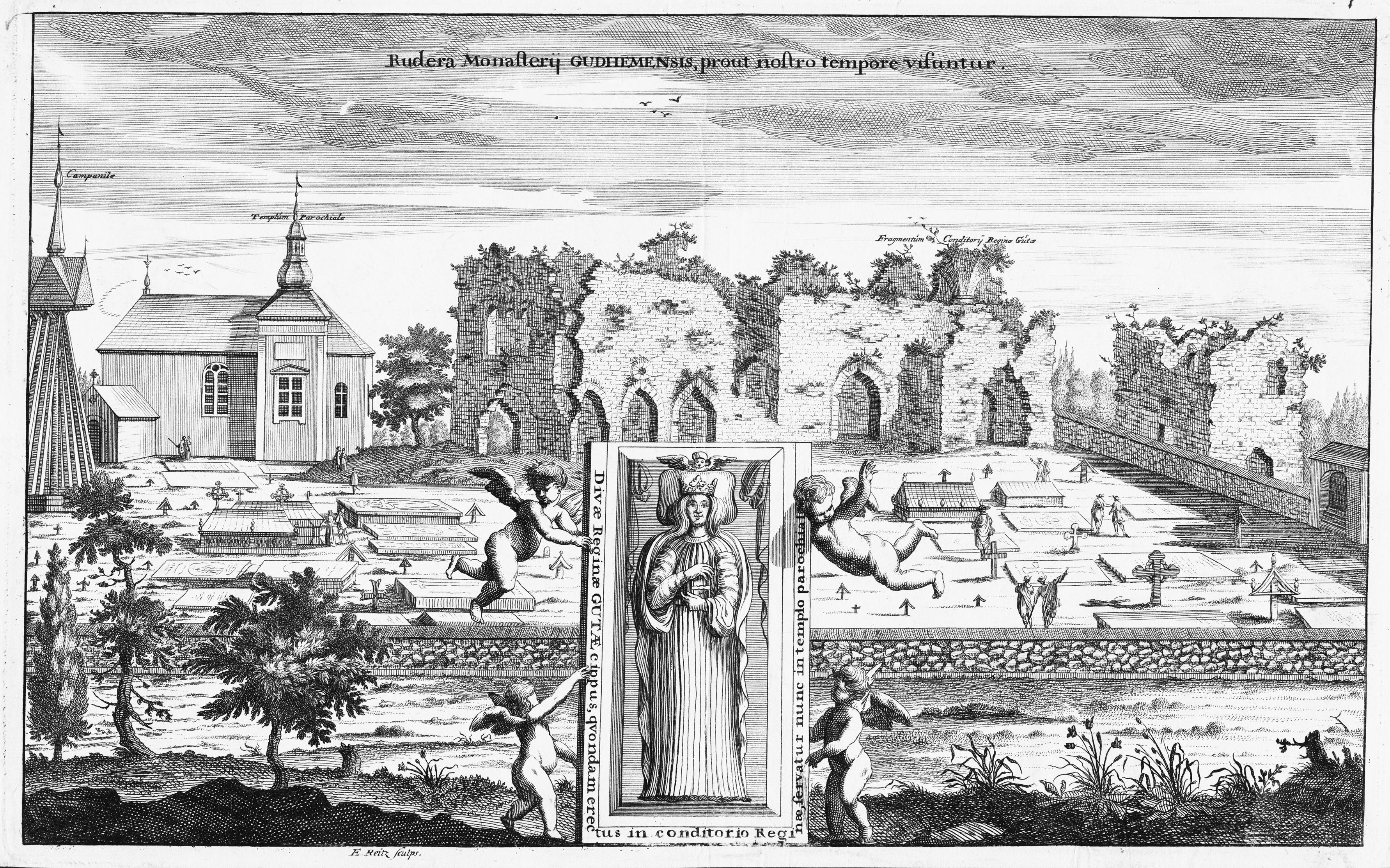 Kyrkan och klosterruinen. Kopparstick utfört av E. Reitz, ur Suecia Antiqua.