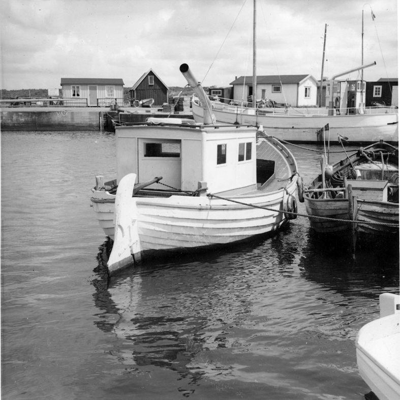 Skåne, Torekov, inre hamnen, i bakgrunden en trålare, nu passagerarbåt. I förgrunden en skånebyggd däcksbåt och en skånesnipa, möjligen Rååbygge. Juni 1962