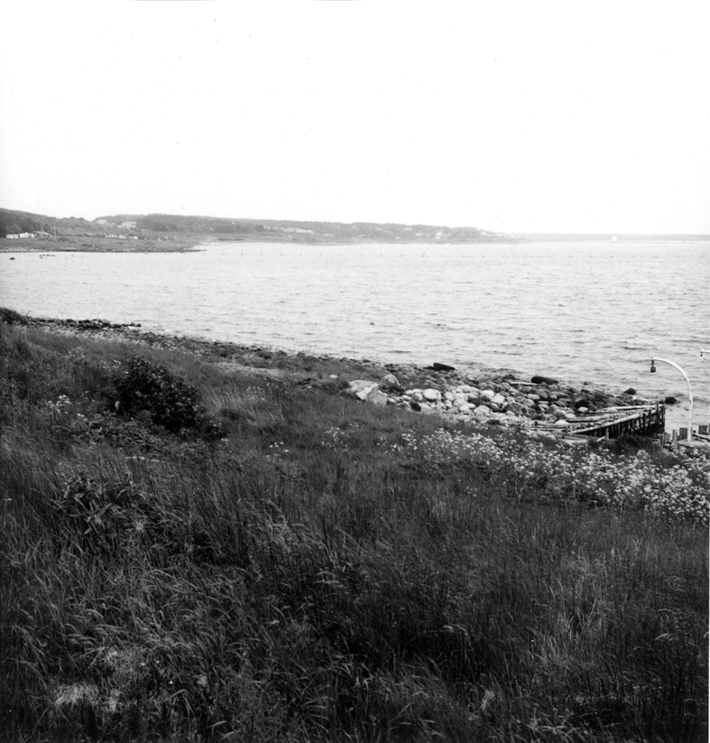 Skåne, Kristianstads län. Barkåkra socken, Skepparkroken. "Varvskås", sedd fr vägen utmeed bebyggelsen. Här var förr en byggplats för småskutor. I senare tid har kåsen delvis fyllts igen och försetts med pålskoning och dävertar. I bakgrunden ett bottengarn. I bildens mitt skönjes en svacka i marken, nu till stor del uppfylld, som markerar byggeplatsen.