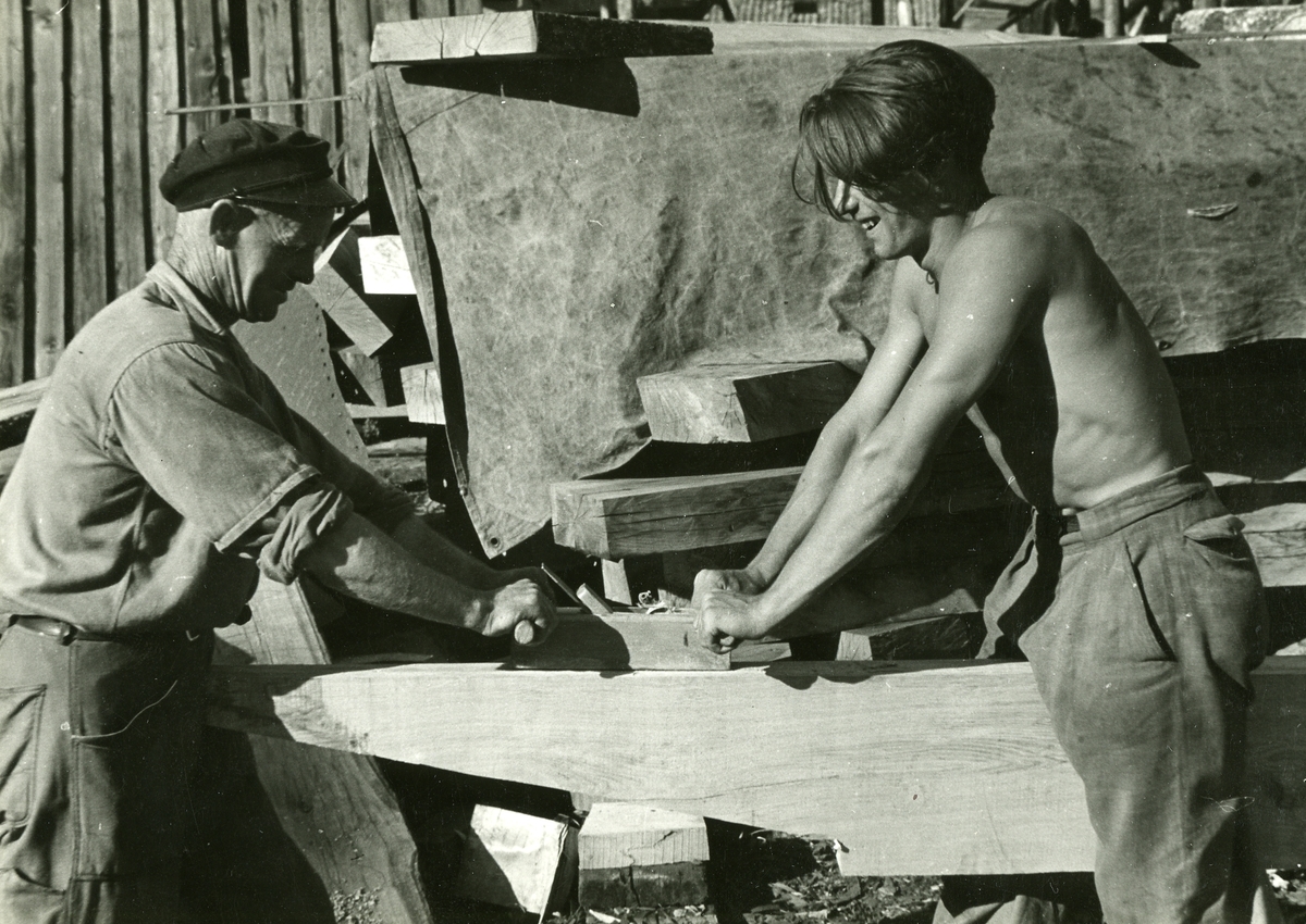 Isländsk fiskebåt under byggnad."Bjälkväggen" (balkvägarna) "lagas till". Kanten "Oxhyvlas".