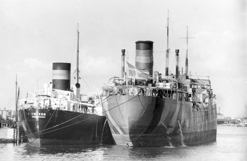 Göteborgs örlogsdepå. Tankfartyg vid Ryanäs oljehamn, Göteborg. fartyget tv på bilden är M/S Trykon av Kungsbacka, det andra fartyget är kam(o)uflagemålat och har namnet övermålat. Fil Gunnar Jonssons undersökningsresa till västkusten juni 1940. 184