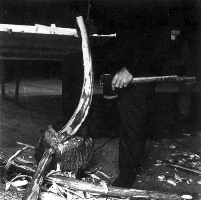 Neg nr 230, Täljning med yxa av spantämne. Foto 15.8 1962.