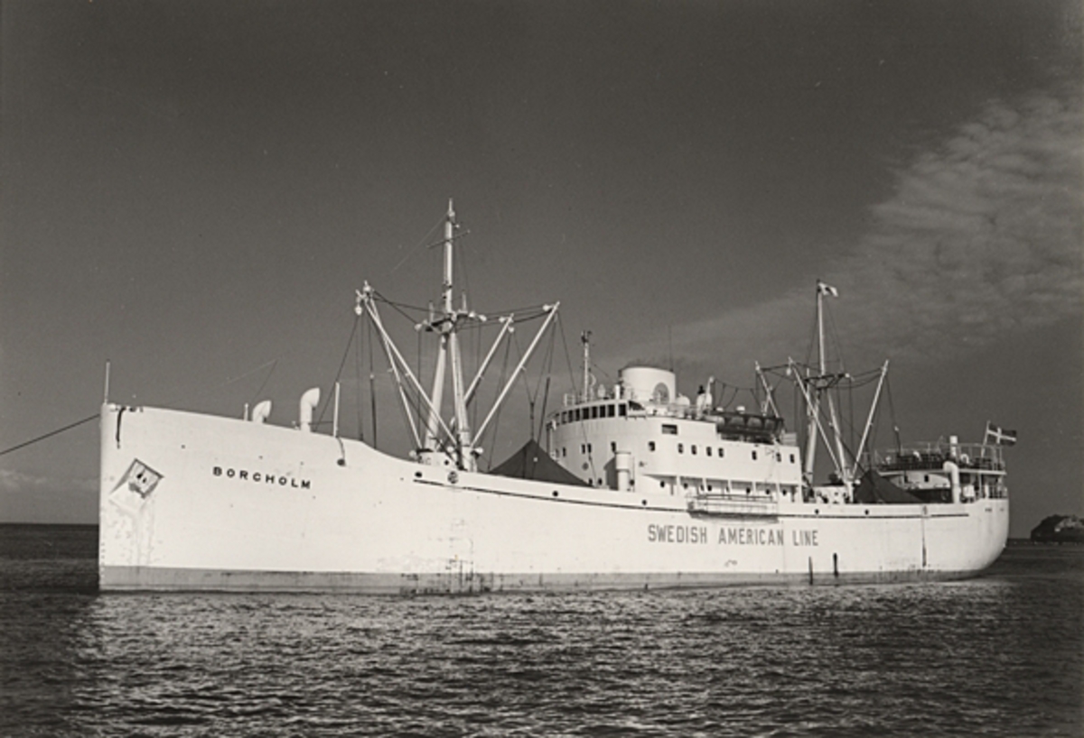 Foto i svartvitt visande lastmotorfartyget "BORGHOLM" i Köpenhamn den 12.5.1956.