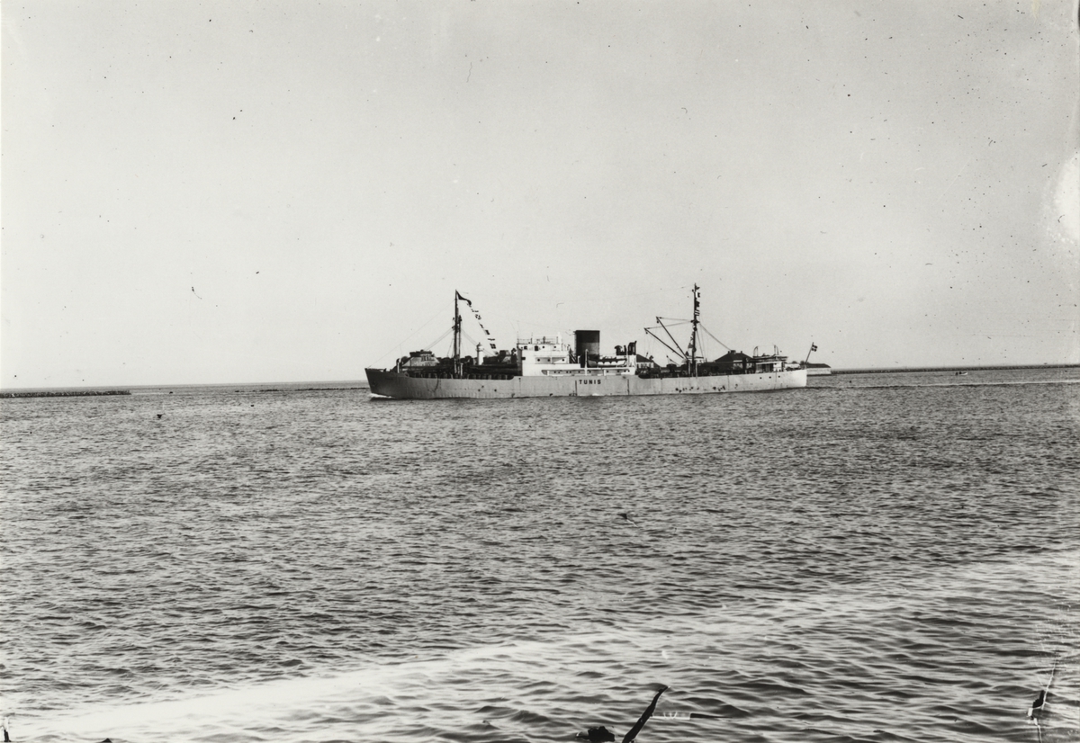 Foto i svartvitt visande lastmotorfartyget "TUNIS" i Köpenhamn.