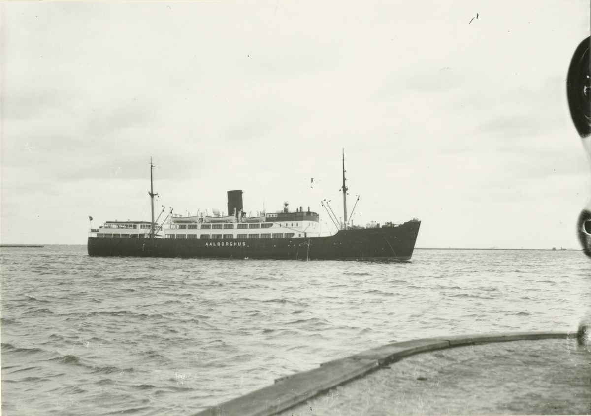 Foto i svartvitt visande passagerar-motorfartyg "Aalborghus" i Käpenhamn under 1940-talet.