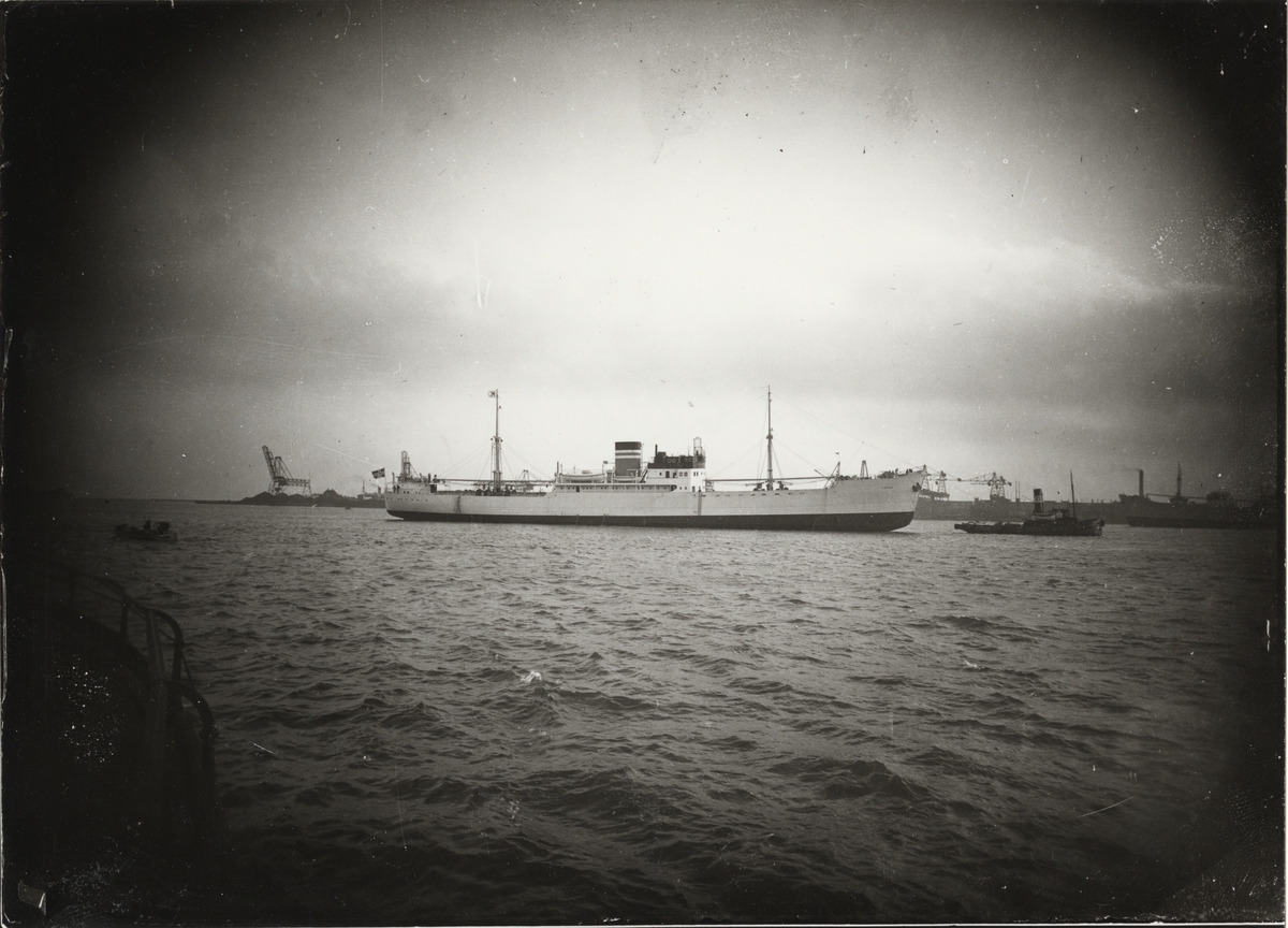 Foto i svartvitt visande last- & passagerarmotorfartyget "VIBRAN" under bogsering i Köpenhamn nder 1930-talet.
