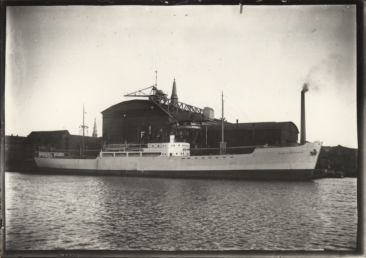 Foto i svartvitt visande lastmotorfartyget "OLAF FOSTENES" av Haugesund vid kaj i Köpenhamn, troligen under senare hälften av 1930-talet.