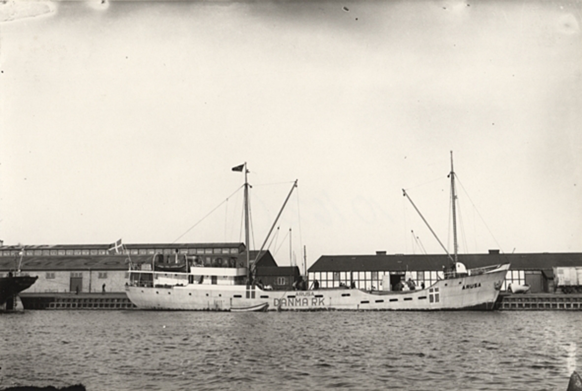 Foto i svartvitt visande Lastmotorfartyget "ARUSA" av Aarhus i Köpenhamn någon gång under åren 1939 - 1940.