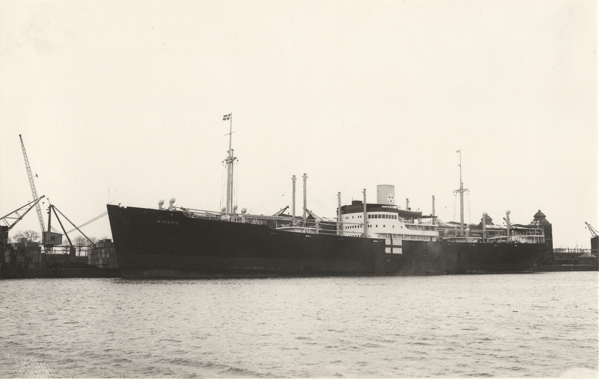 Foto i svartvitt visande lastmotorfartyget "NINGPO" av Göteborg, vid kaj i Köpenhamn under år 1940.