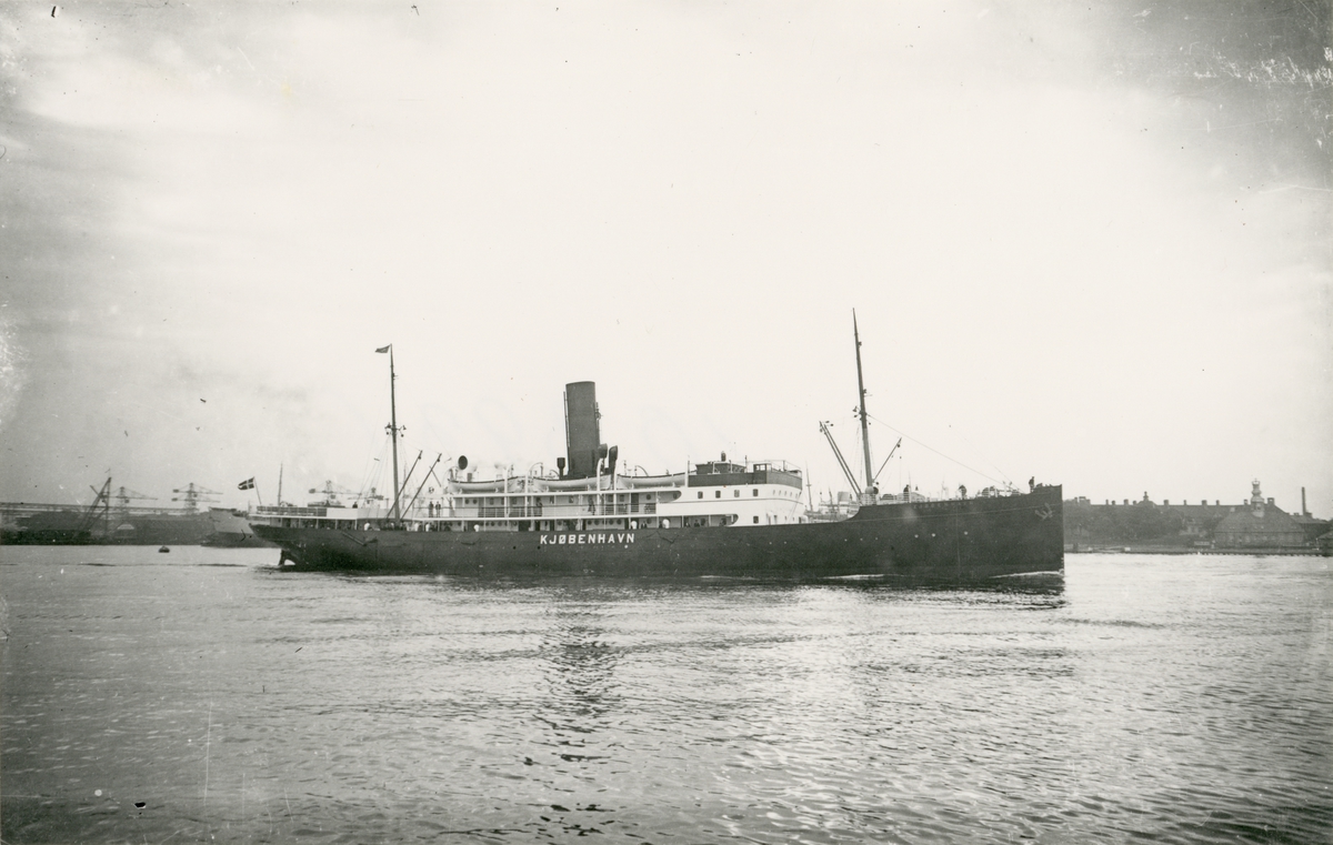 Foto i svartvitt visande passagerarångfartyget Kjöbenhavn i Köpenhamn under 1930-talet