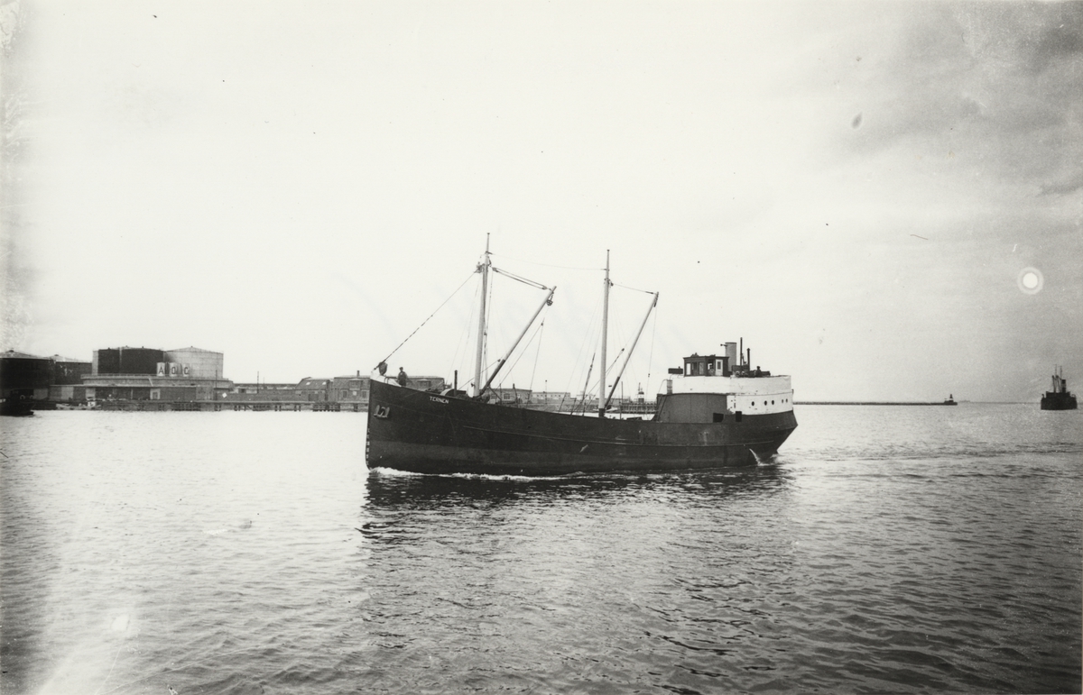 Foto i svartvitt visande lastmotorfartyget "TERNEN" av Aabenraa i farvattnen kring Köpenhamn under 1930-talet.