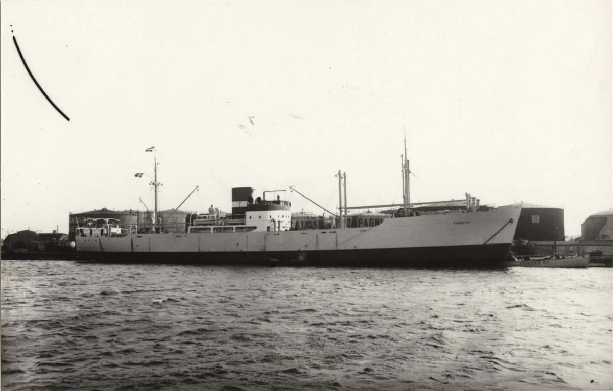 Foto i svartvitt visande lastmotorfartyget "RAGNHILD" av Köpenhamn, vid kaj i Köpenhamn under år 1939.