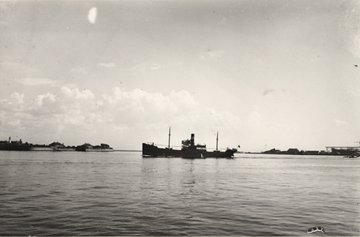 Foto i svartvitt visande lastångfartyget "FRANKRIG" av Köpenhamn under gång i farvattnen kring Köpenhamn under 1930-talet.