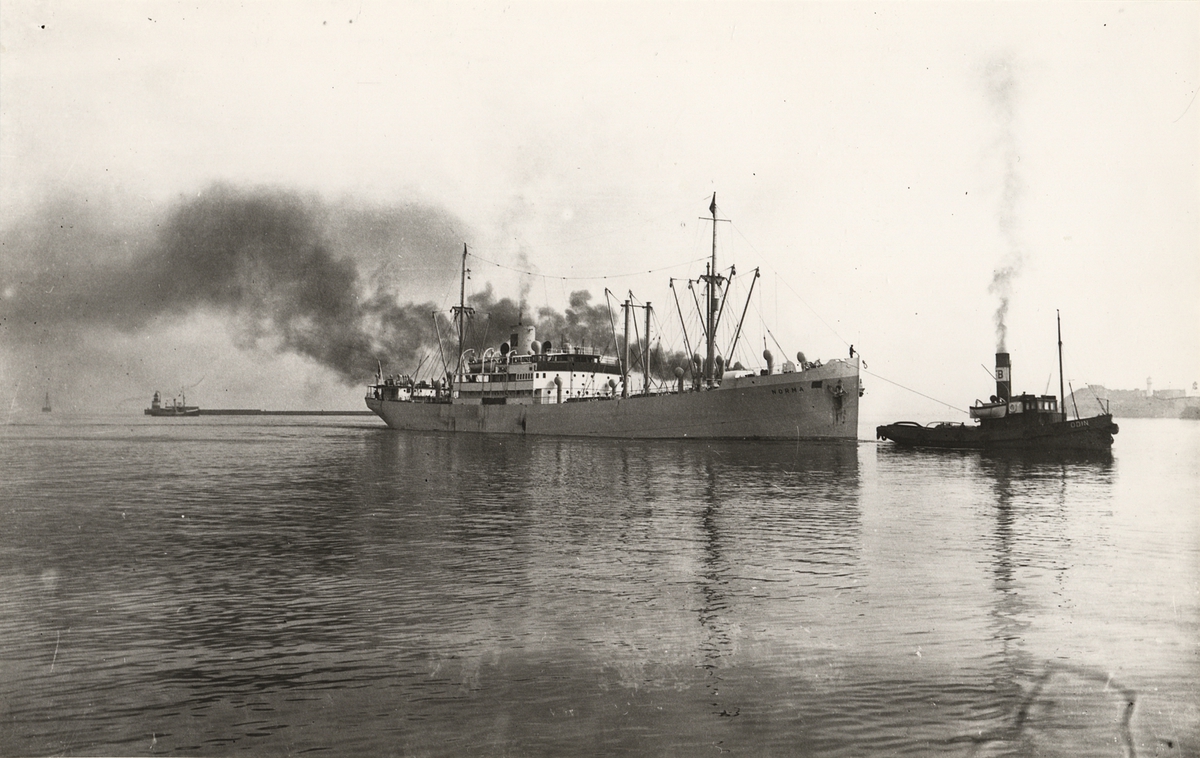 Foto i svartvitt visande lastmotorfartyget "NORMA" av Bergen under bogsering i Köpenhamn under 1930-talet.