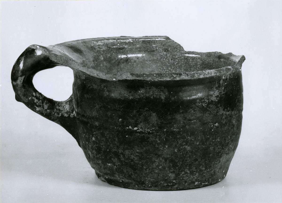 Potta av rött lergods, glaserad, brättet delvis avslaget. Sjöfynd från Djurhamn.