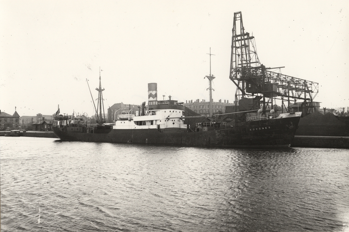 Foto i svartvitt visande last-turbinångfartyget "KORSNES" av Bergen vid kaj i Köpenhamn under slutet av 1930-talet.