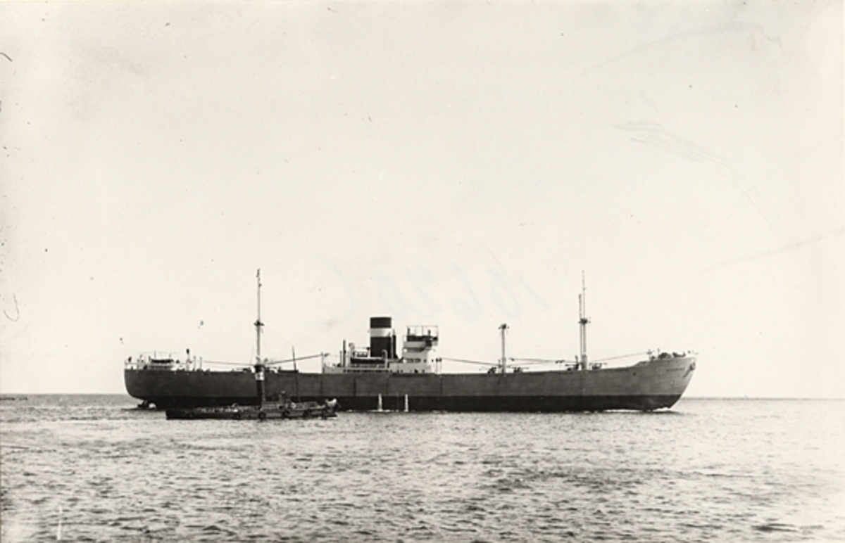 Foto i svartvitt visande lastmotorfartyget "BIDEVIND" av Porsgrunn i Köpenhamn troligen slutet av 1930-talet.
