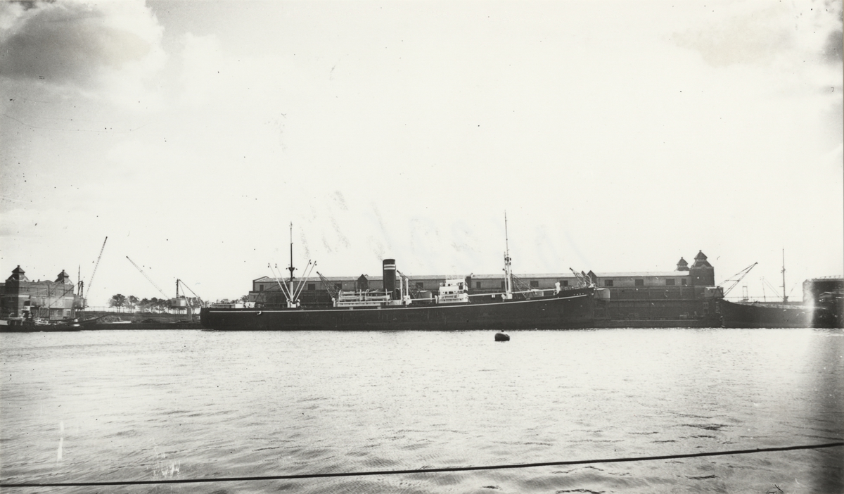 Foto i svartvitt visande lastturbinångfartyget "TANA" av Tönsberg vid kaj i Köpenhamn under 1930-talet.