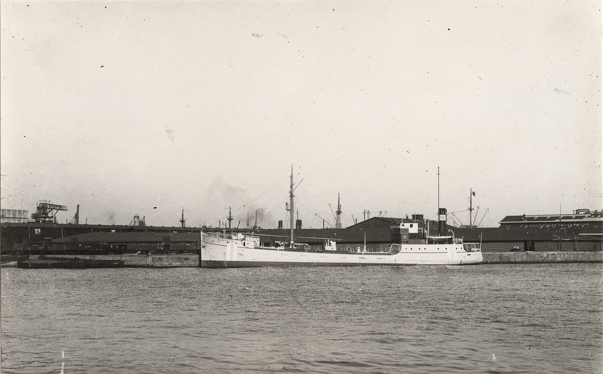 Foto i svartvitt visande tankmotorfartyget "MARGARETA" av Helsingfors vid kaj i Köpenhamn 1930-talet.
