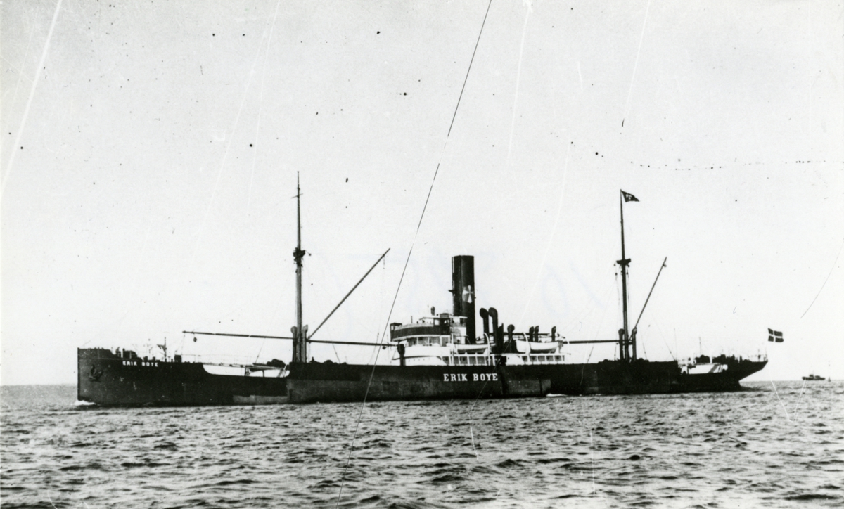 Foto i svartvitt visande lastångfartyget "ERIK BOYE" av Köpenhamn troligen från 1930-talet.