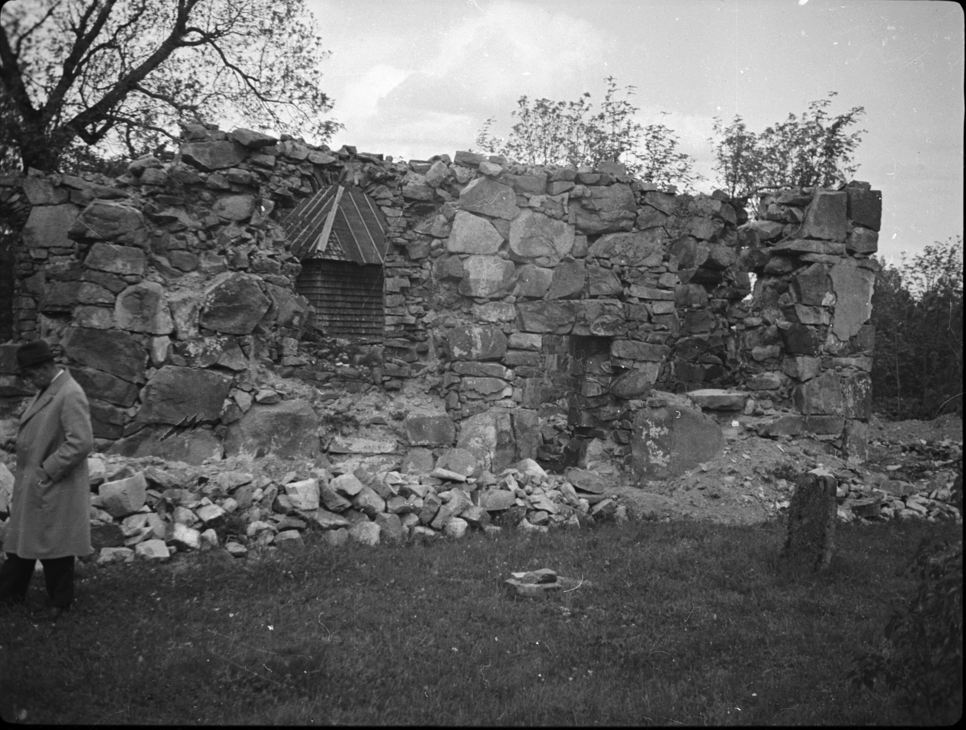 Gamla kyrkans ruiner med sockenmagasinet i bakgrunden.