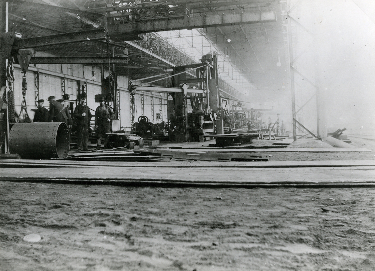 Foto visande T. Herlin, andra man från höger, som fartygsplåtslagare vid Flensburger Schiffbaugesechellschafts varv sommaren 1903, med en lön av 21 pfenning i timmen. (10 timmars arbetsdag).