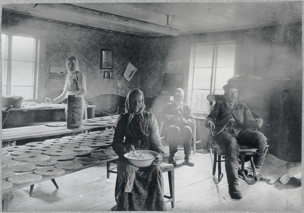 [från fotobeskrivning:] "Tunnbrödsbak på Östra Jakos i Söderby 1913. Mormor sitter och rör till deg till kaffebröd, mor bakar, morfar pliggar skor och morbror (Leonard Eriksson) som emigrerat är på besök hem från Amerika"