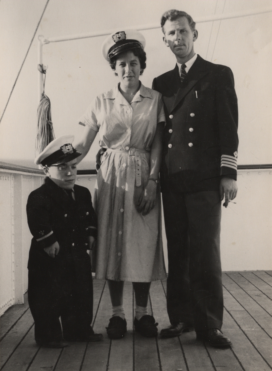 Befälhavaren ombord å tankmotorfartyget JALTA av Sandefjord, med hustru samt radiotelegrafisten. Fotot taget i Limhamn i maj 1954.