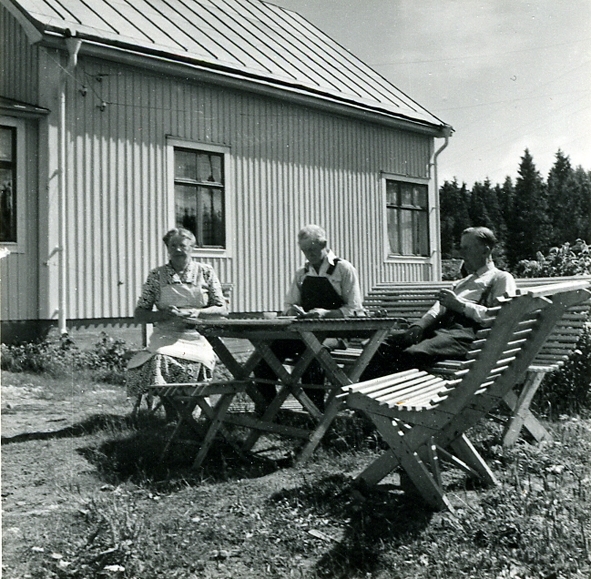 Båtbyggare Karl Dahlkvst, hans fru och ingeniör Henry Magnusson på kaffeterassen.