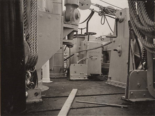Lastmotorfartyget BRASIL av Stockholm, byggt i Göteborg 1935. Detalj av däcket akter om fockmasten från babord.