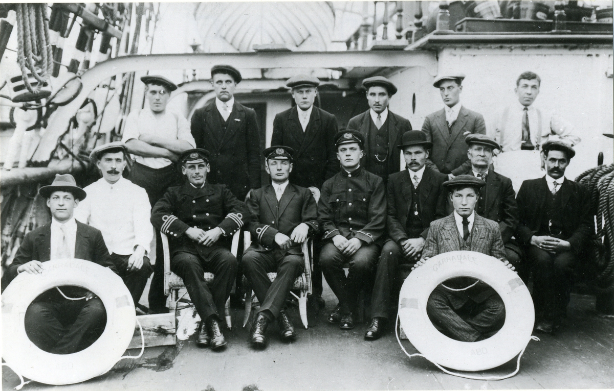 En del av 4-mastade barken Caredale av Åbo besättning. Foto [i] Sharpness, aug. 1915