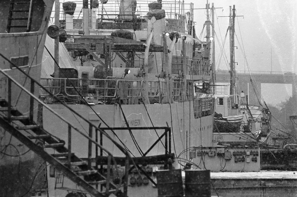 Fartyg på Ekensbergs varv 1970. I mitten sjömätningsfartyget JOHAN MÅNSSON, i bakgrunden skymtar det västtyska lastmotorfartyget ANNE LUND (urspr. CHARLOTTE BOHL).