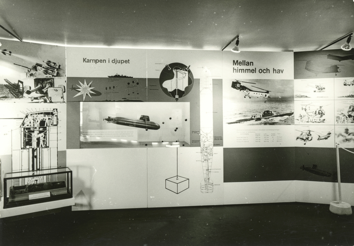 Örlogsutställningen. Skärmvägg som visar "Kampen i djupet" och "Mellan himmel och hav".