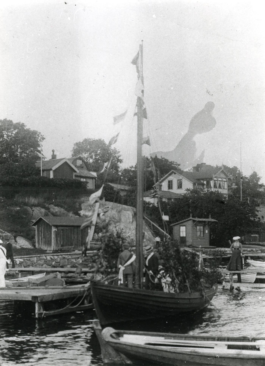 Gamla Dalarö. Dalaröklubben. Vid 1900-talets början fanns en populär sammanslutning som kallades Dalaröklubben. Den bestod till största delen av sommargäster och på programmet stod bl.a. teaterföreställningar och sommarfester. Initiativtagare till klubben var Dalarös badläkare, dr. Willner, som teaterdirektör fungerade tandläkare Ling. På bilden stiger just Kung sommar iland för att tas emot av folket, innan han med följe och musikkår beger sig till Schweizerdalen för att inleda sommarens festligheter.