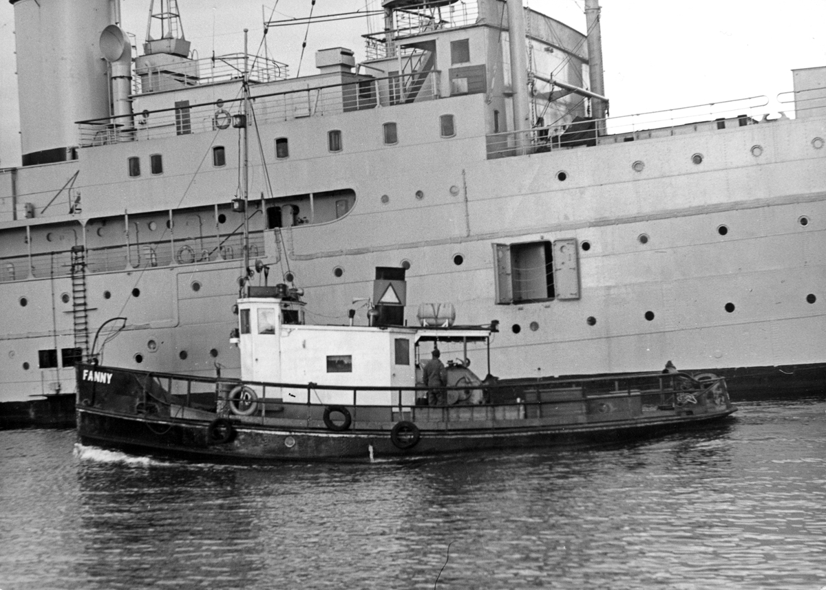 Bogserbåten FANNY passerar framför ubåtsdepåfartyget PATRICIA (A206).