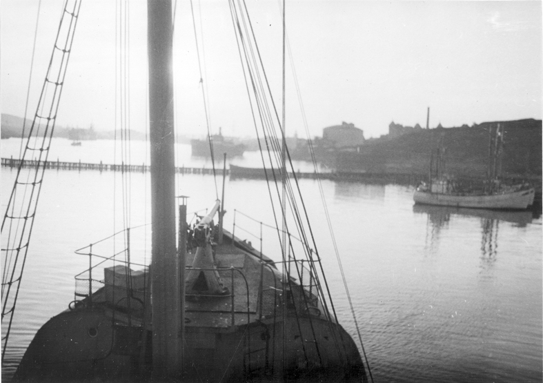 Göteborgs örlogsdepå. Resan anträdes med HM Hjvb 384 en junimorgon från Göteborgs örlogsdepå. Fartyget har just kastat loss och lämnar bryggan. Fil. lic. Gunnar Jonssons undersökningsresa till västkusten juni 1940. 65.