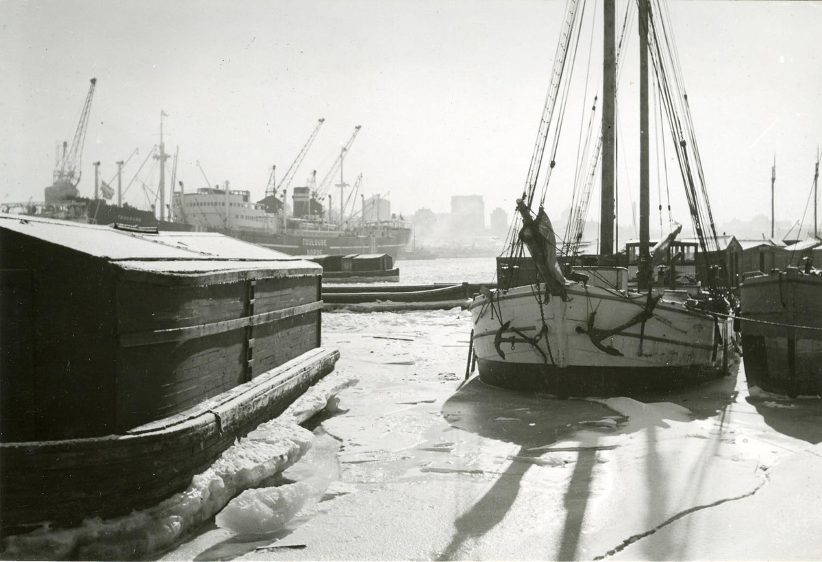 Infrusna fartyg och pråmar i Frihamnen. Bilden tagen från sjöstaketet. I bakgrunden Otterhall.