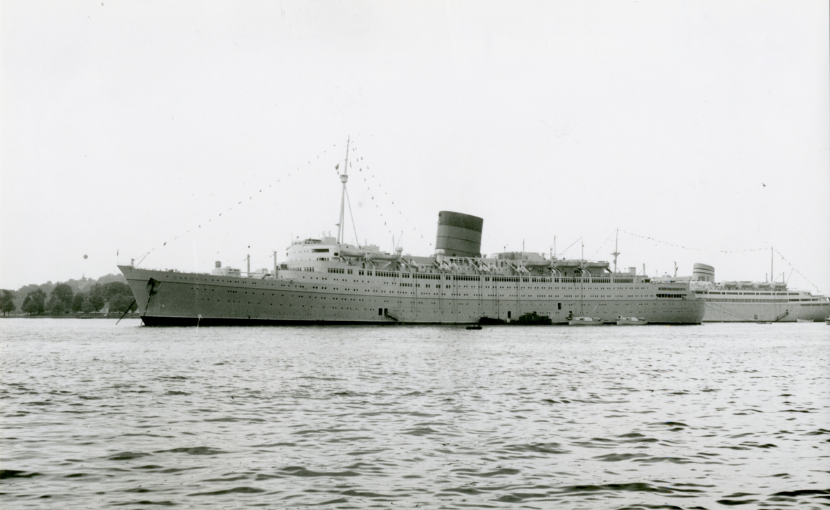 Foto från 1958 visande turist-& passagerarturbinångfartyg CARONIA av Liverpool för ankar på Stockholms ström.