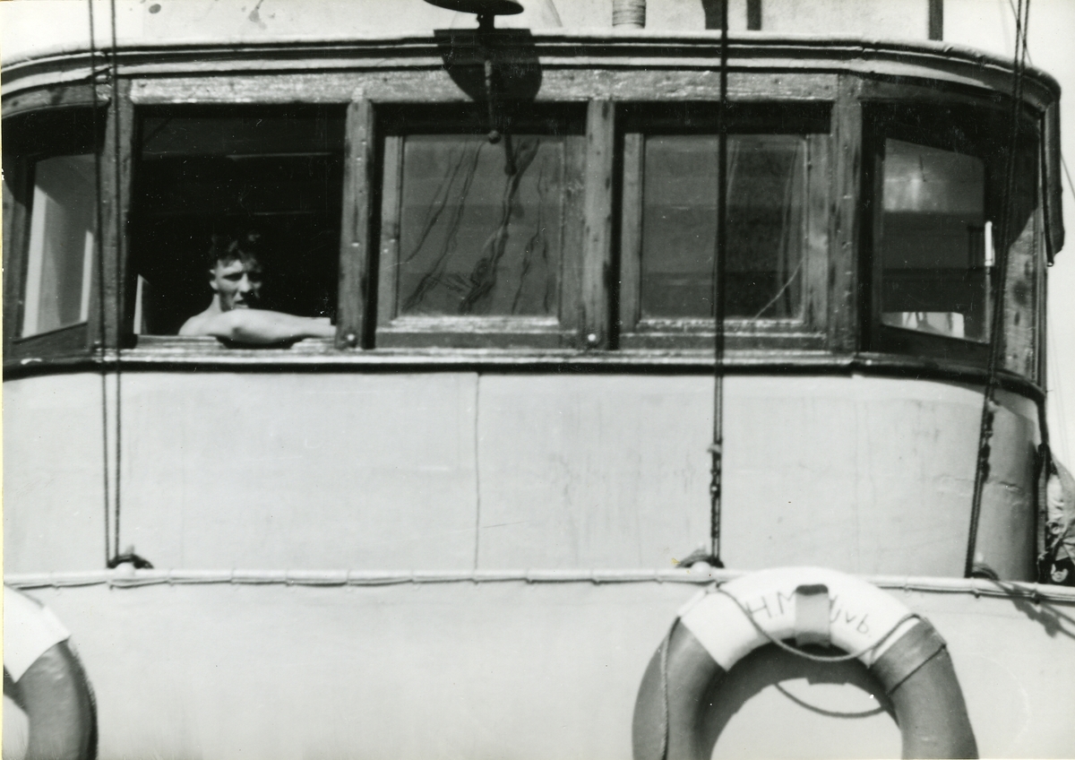 Göteborgs Örlogsdepå. H.M. Hjvb 384. Bryggan och navigationshytten på förkant. Mannen i fönstret är vakthavande flaggkorpralen.
