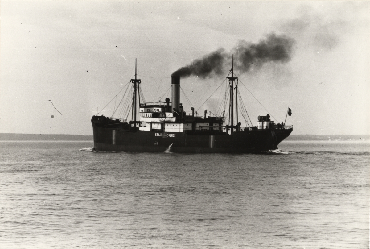Göteborgs örlogsdepå. Lastångfartyget RANJA av Stockholm har just passerats av vedettbåten inom 3-milsgränsen. Sedan flaggan på spelet akter nedhalats till hälsning, går flaggan åter i topp.