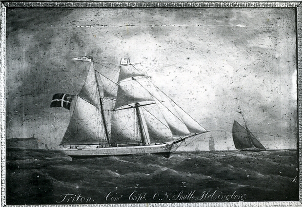 Fartygstavla hos fru Ruth Pålsson. Triton Com:r Capt:n O. N. Smith Helsingborg. Oljemålning på duk utan signatur. Skåne, Malmöhus län, Viken.