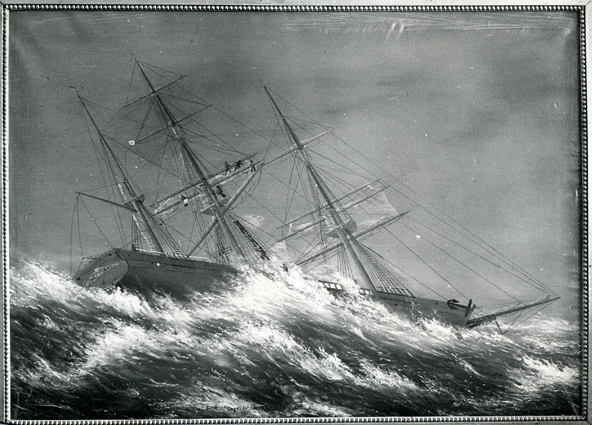 Fartygstavla hos fru Ruth Pålsson. Bark W:M Volckens, Capt. Nilsson under en orkan i latitud N 40 longitud W 54,30, den 2 september 1887. Oljemålning på duk signerad P. Viekl 1887. Skåne, Malmöhus län, Viken.