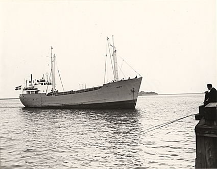 Titel: Foto i svartvitt visande lastmotorfartyget "Alfa" i Köpenhamn under år 1953.