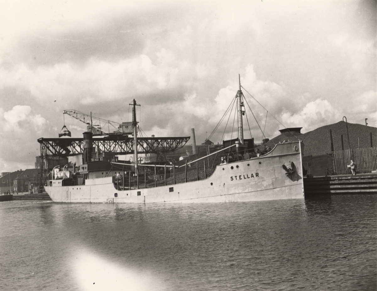 Foto i svartvitt visande lastångfartyget "STELLAR" med last av kol vid kaj i Köpenhamn den 28.8.1953.