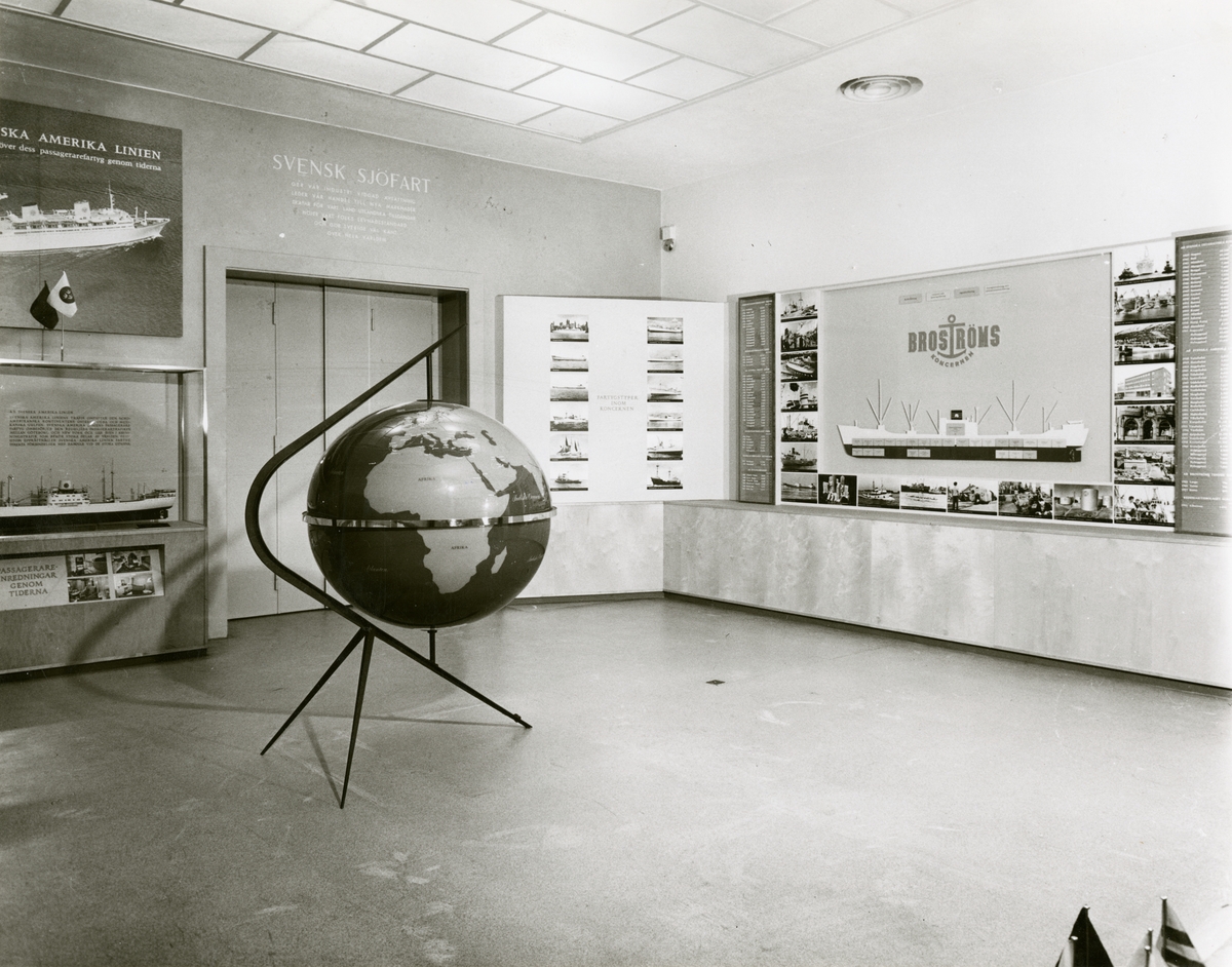 Interiör från Sjöhistoriska museet. Broströmskoncernens utställning i Sjöfartsavdelningen, rum18. Utställningsinteriör.