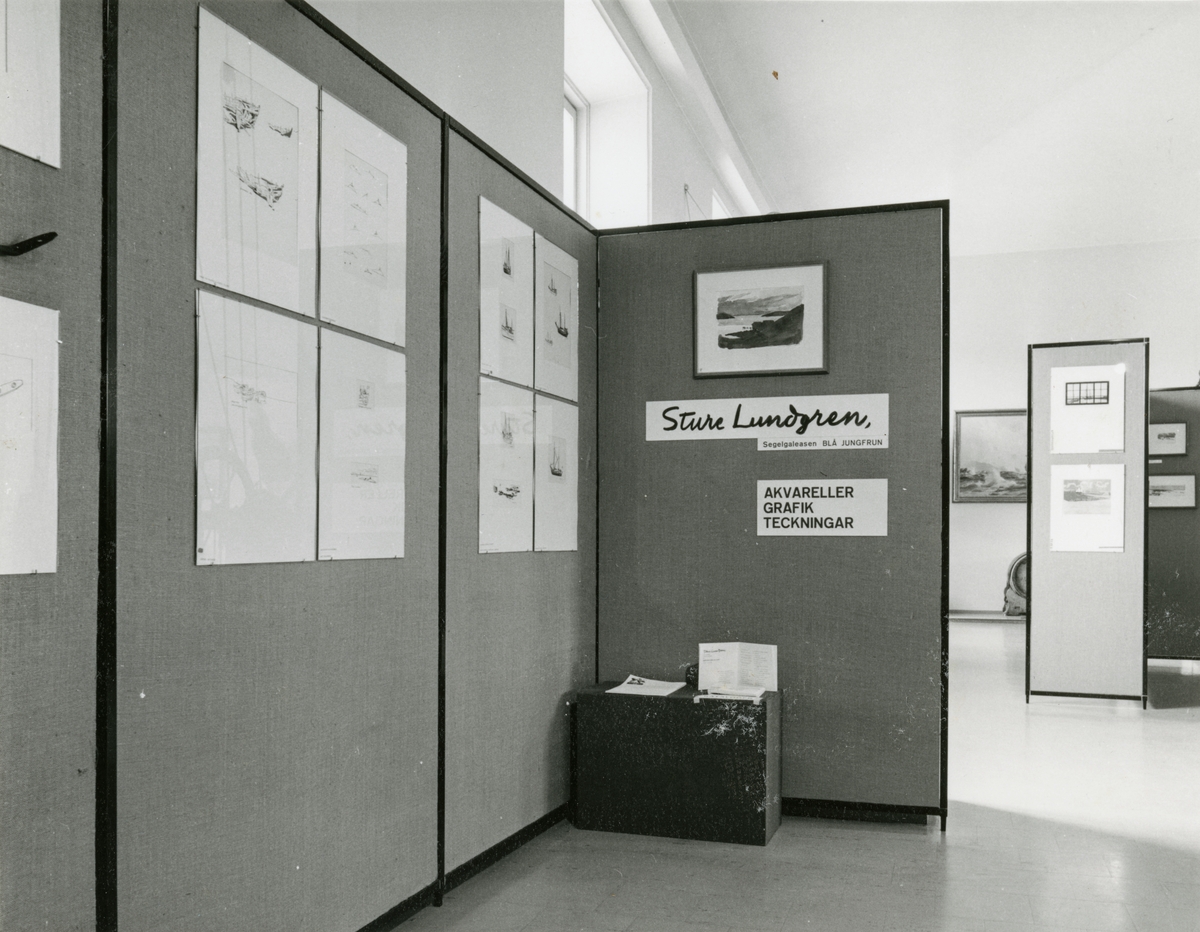 Utställningen "Sture Lundgren, segelgaleasen Blå Jungfrun". Akvareller, grafik och teckningar. Utställningsinteriör visande inledningsskärmen.