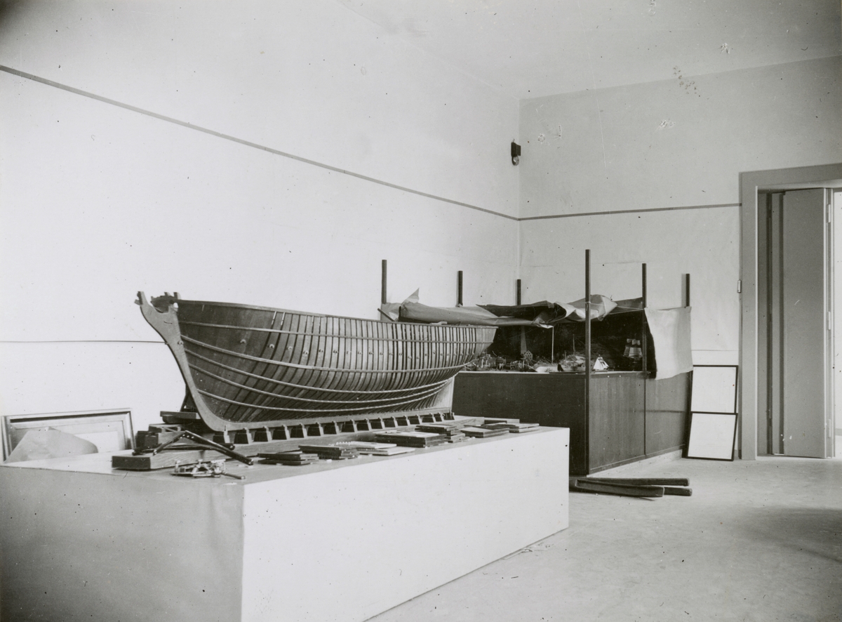 Samlingarna under uppordnade våren 1936. Utställningen i Sjöfartsavdelningen växer fram. Avdelningen för äldre varv.