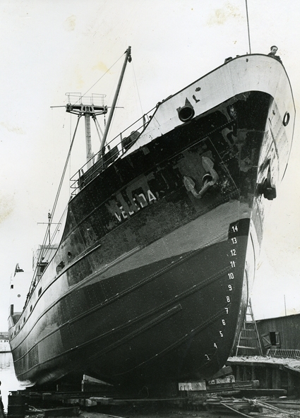 Holms skeppsvarv. S/S Veleda klar för sjösättning efter reparation 1956.