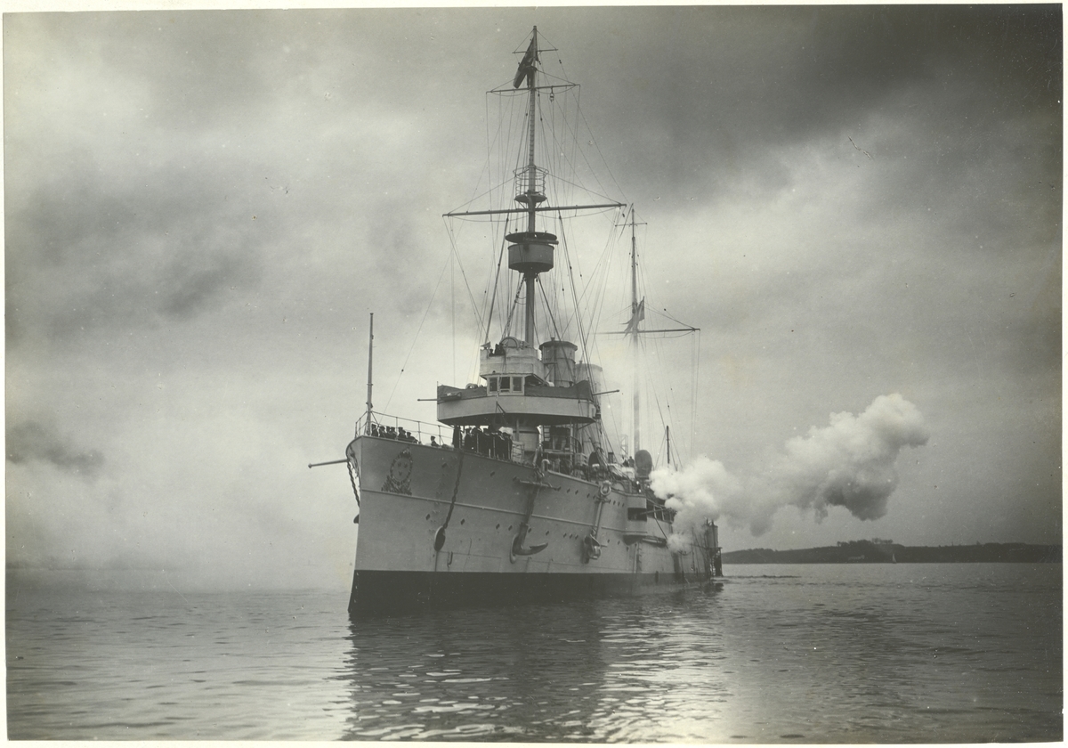 Pansarkryssaren FYLGIA saluterar tyska flottan i Kiels hamn